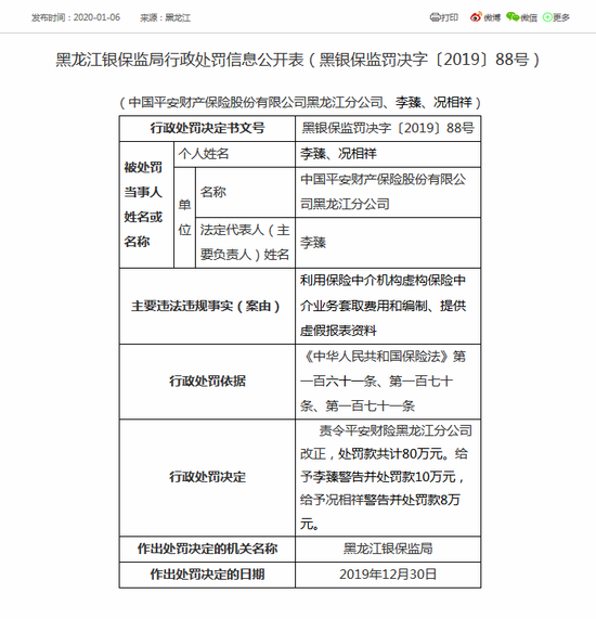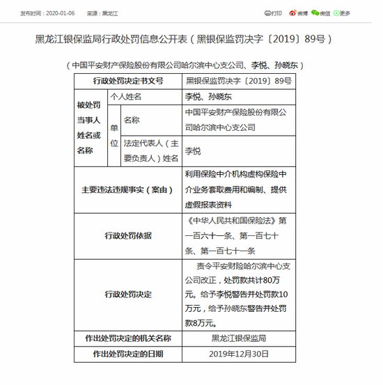 平安财险黑龙江分公司被罚款共计80万元,负责人李臻被警告并处罚款10万元,负责人况相祥被警告并处罚款8万元。平安财险哈尔滨中心支公司被处罚款共计80万元,负责人李悦被警告并处罚款10万元,负责人孙晓东被警告并处罚款8万元。