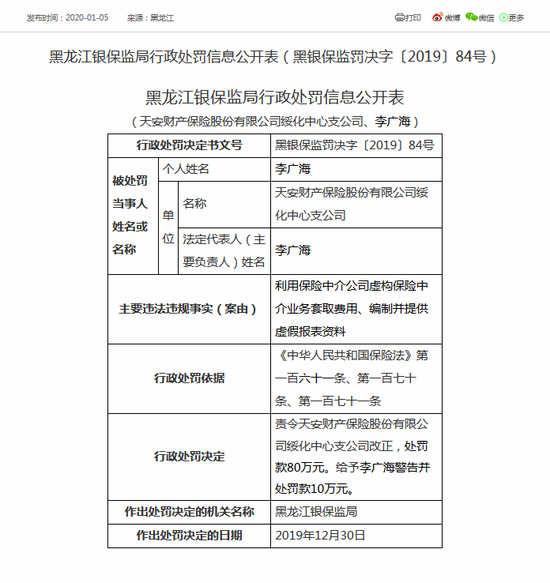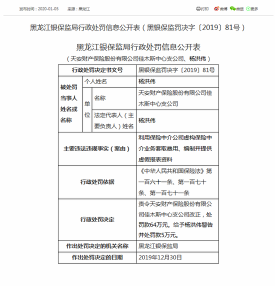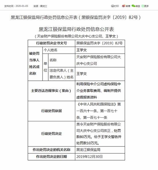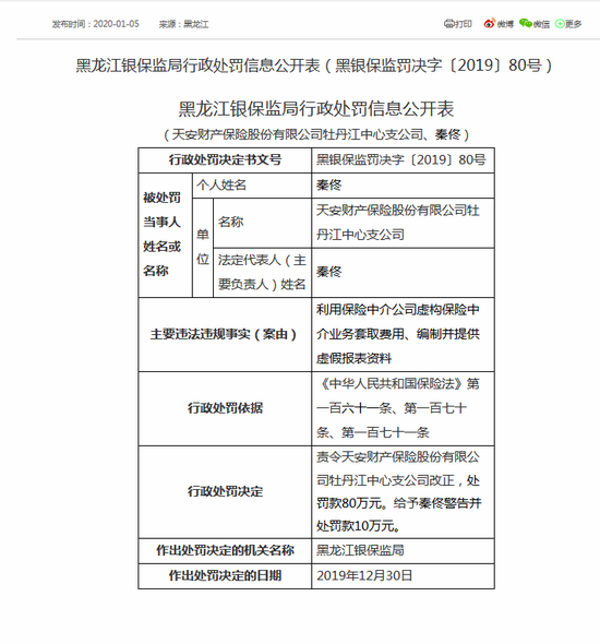 其中,天安财险齐齐哈尔中心支公司、牡丹江中心支公司、大庆中心支公司、绥化中心支公司均因利用保险中介公司虚构保险中介业务套取费用、编制并提供虚假报表资料,被各自罚款80万元;上述中心支公司负责人何兆静、秦佟、王学文、李广海也分别被警告并处罚款10万元。天安财险佳木斯中心支公司因利用保险中介公司虚构保险中介业务套取费用、编制并提供虚假报表资料,被罚款64万元,负责人杨洪伟被警告并处罚款5万元。天安财险双鸭山中心支公司因利用保险中介公司虚构保险中介业务套取费用、编制并提供虚假报表资料,被罚款54万元,负责人常俭春被警告并处罚款5万元。