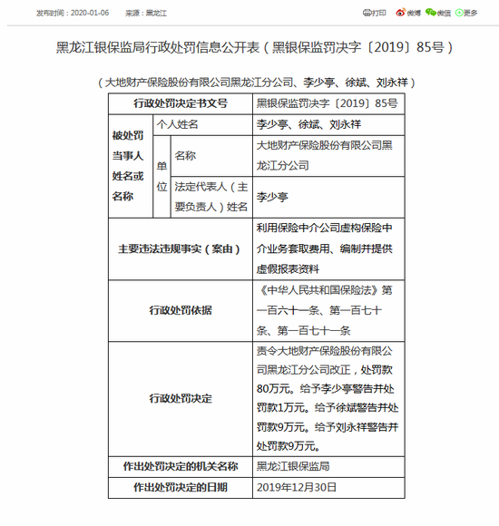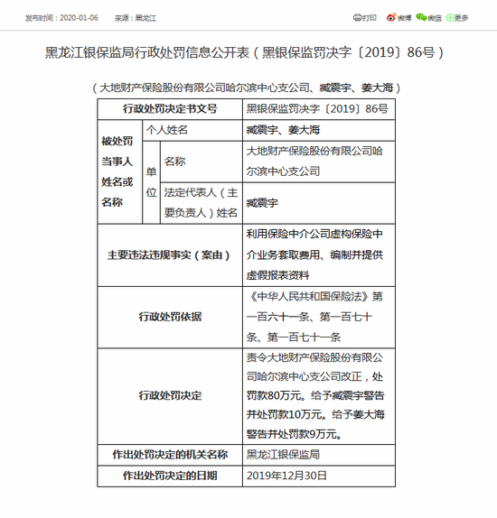 大地财险黑龙江分公司被处以80万元罚款。三个相关负责人都被给予警告,三人累计被罚19万元。大地财险哈尔滨中心支公司被罚款80万元,负责人臧震宇被警告并处罚款10万元,负责人姜大海被警告并处罚款9万元。大地财险大庆中心支公司被罚款39万元,负责人肖冰被警告并处罚款5万元。